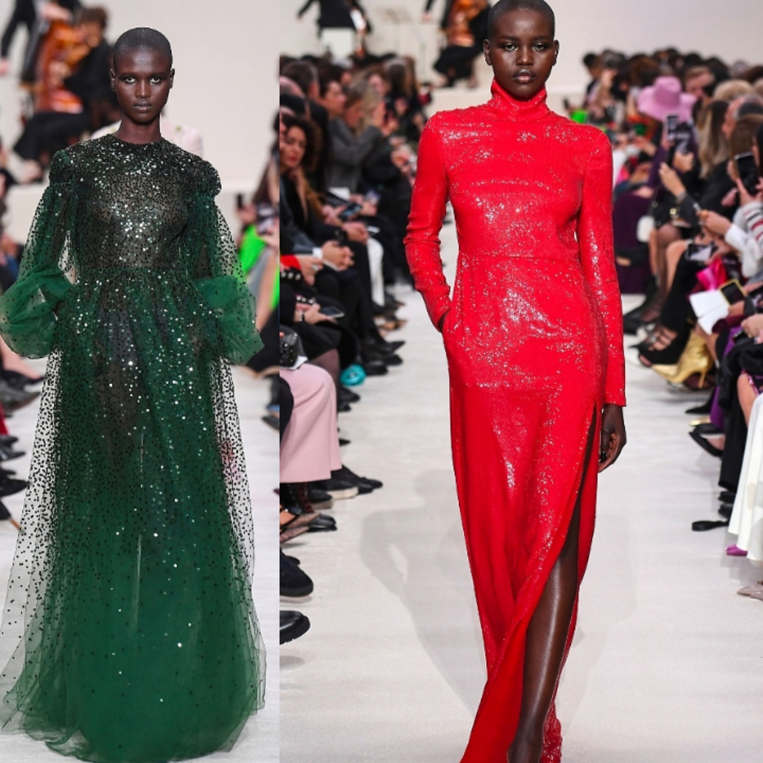 Лаконичные закрытые вечерние платья, черные или полностью сшитые из ткани в пайетки. В таком наряде девушка будет подобна статуэтке (Bottega Veneta, Balenciaga, Valentino).