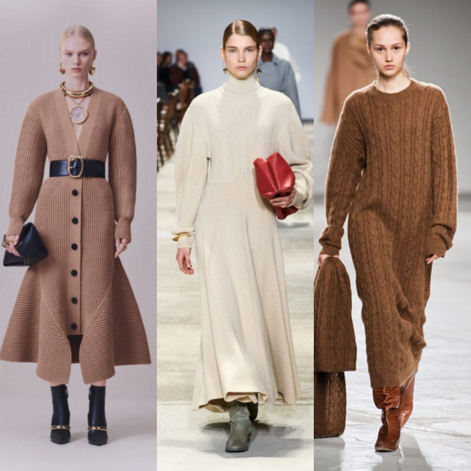 Платья из трикотажа. Плотной вязки с длинными рукавами, уютные и мягкие, они были представлены на подиумах у многих дизайнеров. Цвета встречались лаконичные, нейтральные – как серый, бежевый, так и насыщенные оттенки синего и аквамарина (Isabel Marant, Proenza Schouler).