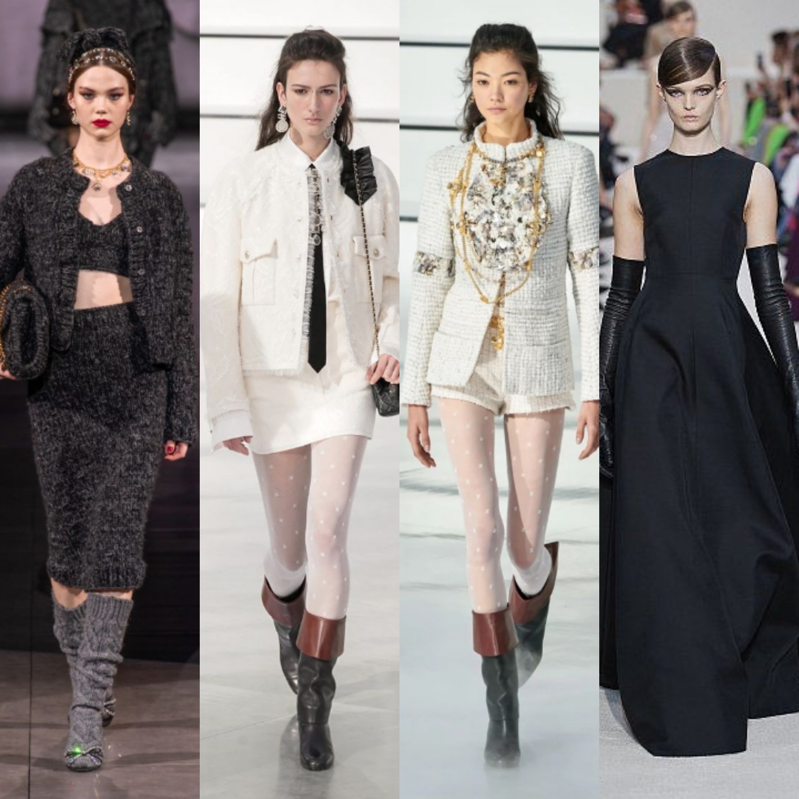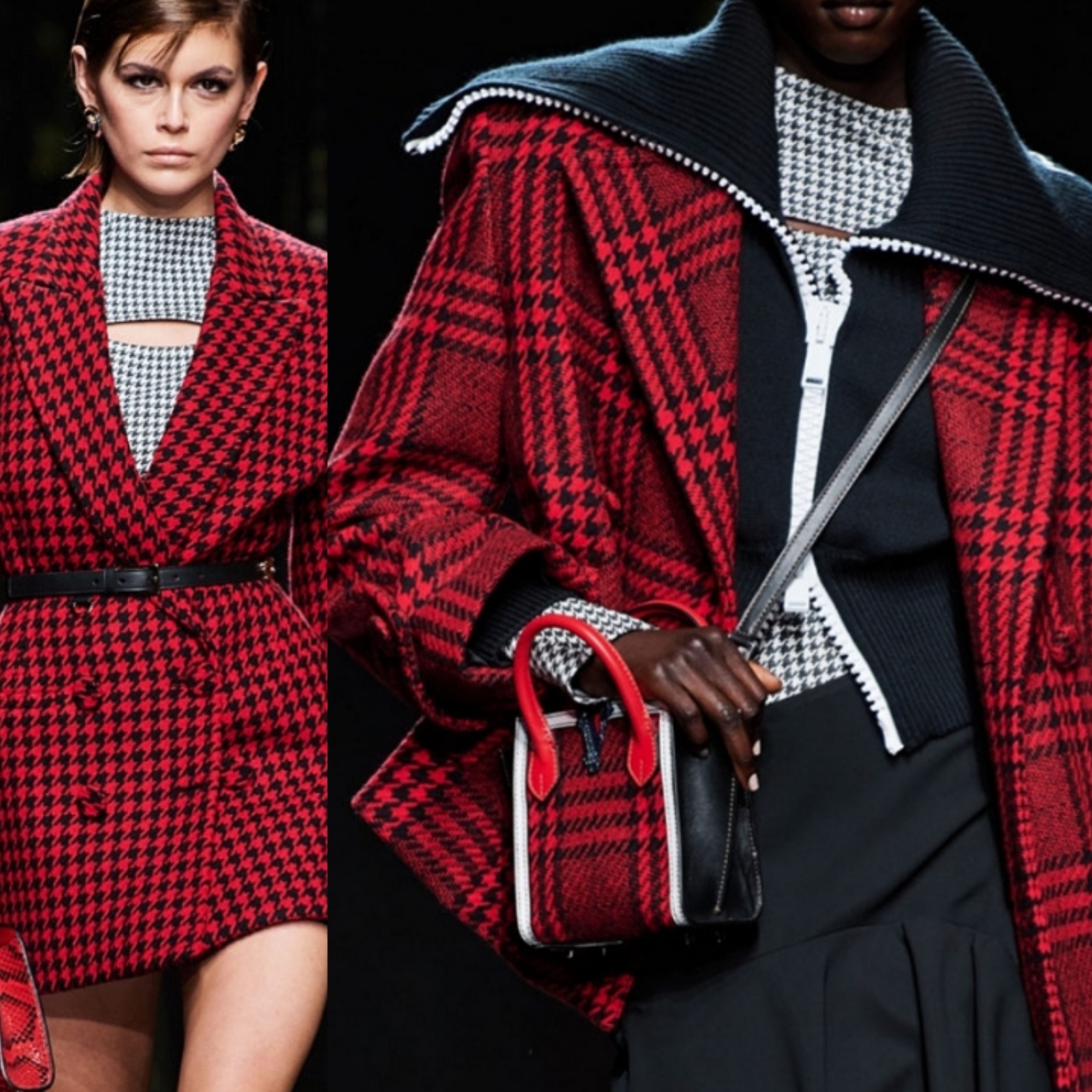 Принт «гусиная лапка» во всевозможных вариациях и разных масштабах встречается в коллекциях повсеместно на платьях, костюмах на таких шоу, как Versace, Off-White.