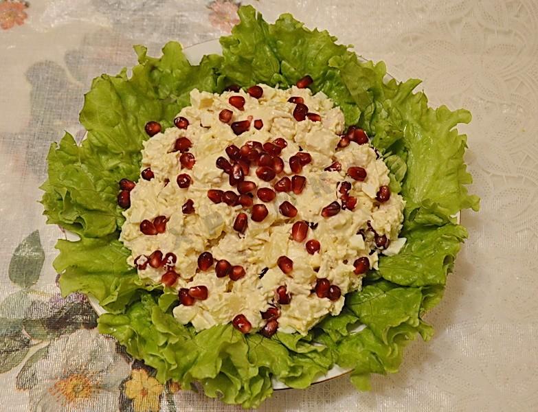 Нам понадобится: 500 г куриного филе, 200 г сыра, 100 г грецких орехов, зерна половины граната, майонез.