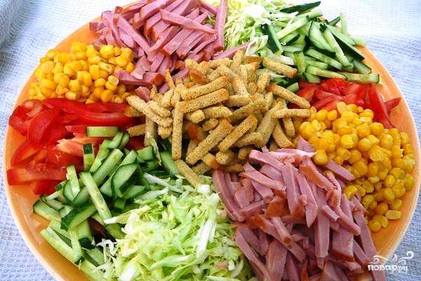 Для оформления этого салата понадобится плоская тарелка большого диаметра. Ветчину, колбасу, огурец, помидор, перец, кукурузу и капусту выложить по кругу тарелки горками, в центр тарелки налить майонез и присыпать его сухариками.