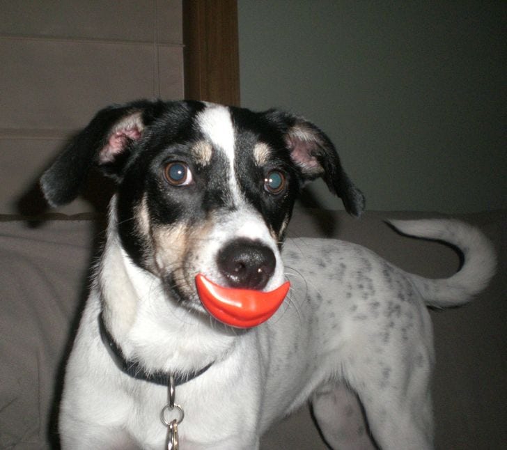6. А этот барбос захотел себе красные губы и решил спросить мнение у хозяина, идет ли.