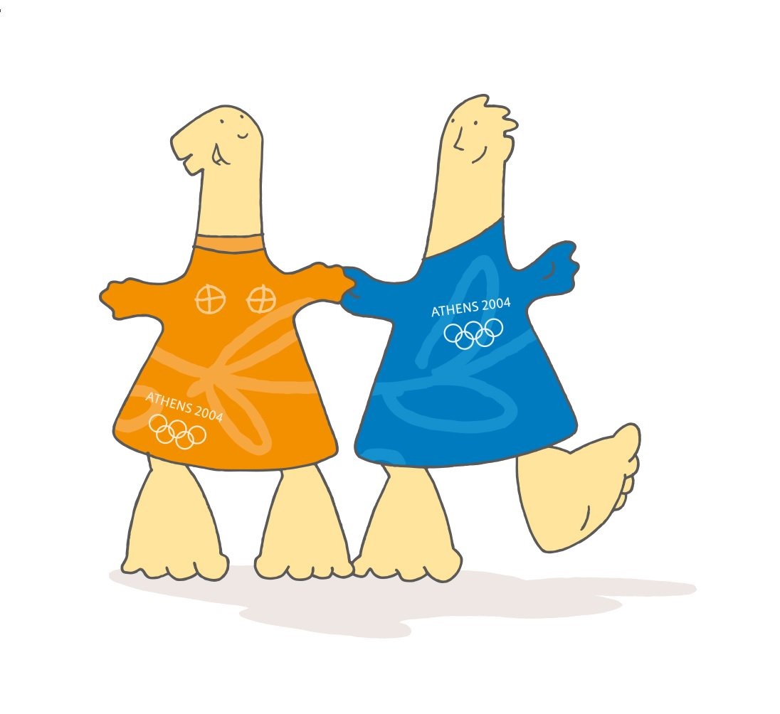2004 год – Афины. Греческие талисманы даже названы были в честь древних богов – бога света Аполлона (Феба) и богини мудрости Афины. Талисманы стали точными копиями древнегреческих кукол VII века до н. э. Они символизируют единство истории и современности.