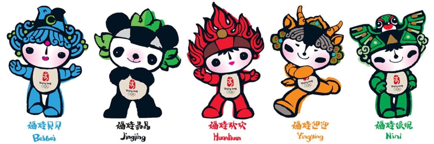 2008 год – Пекин. Сопровождать зрителей и участников китайской Олимпиады довелось сразу пяти персонажам – «Детям удачи». Каждый из талисманов символизирует определенный континент, в цвет которого он окрашен. Вторая версия говорит о том, что это символы пяти стихий: огня, воды, леса, земли и неба. Талисманы получились добрыми и приветливыми: если сложить начальные буквы их имен, то получится фраза «Пекин приветствует вас».
