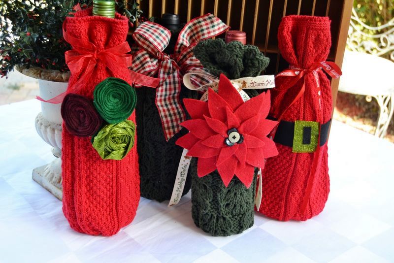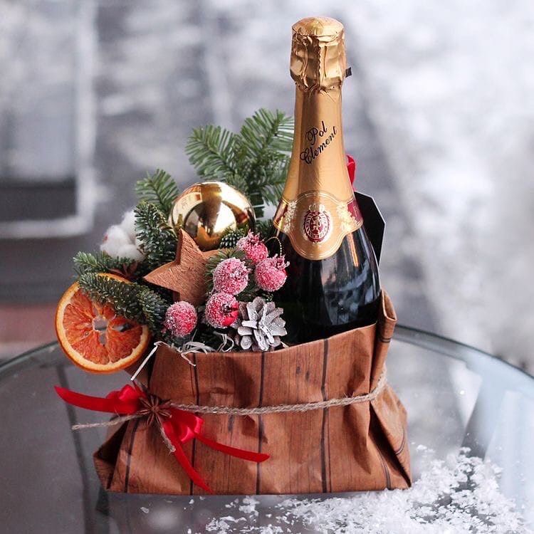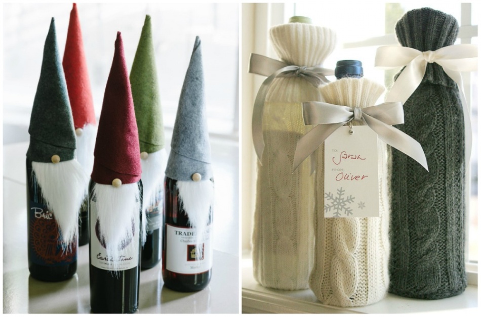 Если хотите интересно преподнести спиртной напиток, существует множество вариантов оригинальных оформлений. Можно «упаковать» бутылку в вязаный рукав, подвязав красивым новогодним бантом, либо же превратить его в смешного гнома, приделав бороду (кусок искусственного меха) и сделав колпак (например, из фетра, который можно закрепить двусторонним скотчем).