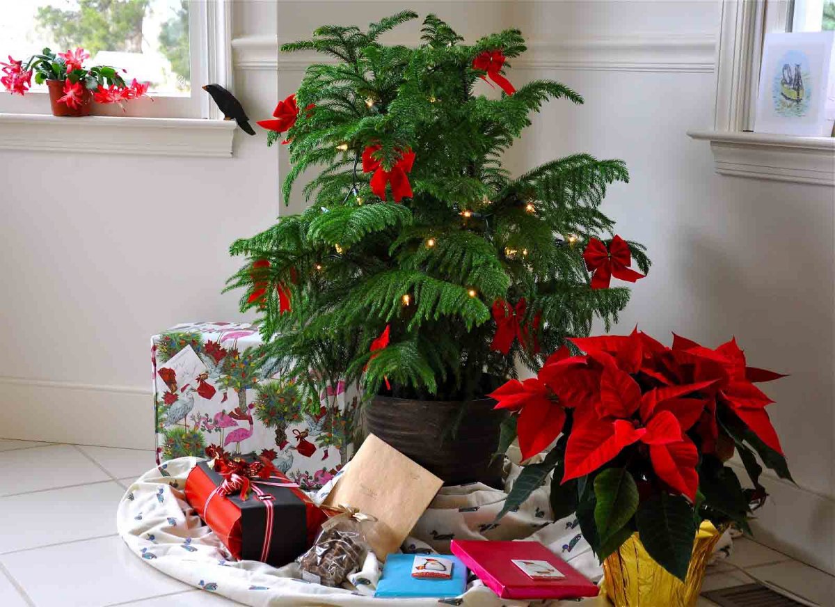 Пальмы, фикусы и подобные растения можно декорировать елочными игрушками (если они достаточно невесомы). Кроме того, сейчас в магазинах огромный выбор подобных украшений для растений, которые круглый год радуют своим обликом. А в честь Нового года можно украсить их яркими ленточками и бантиками.