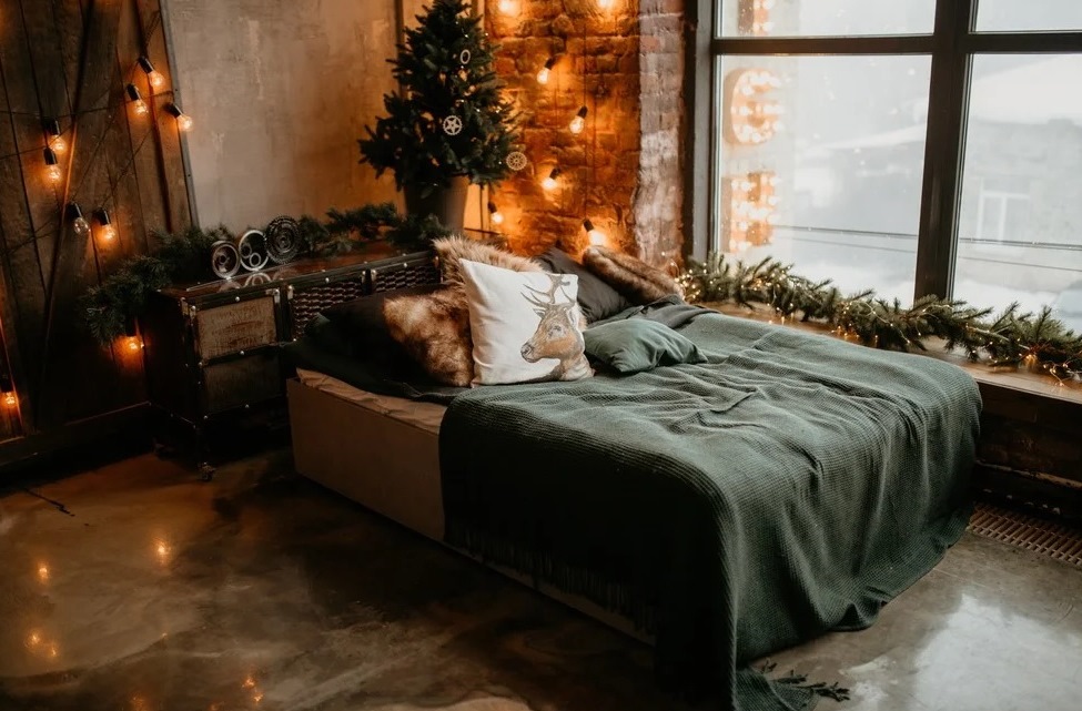 Обычно спальня находится дальше других комнат от входа и ее видит гораздо меньшее количество людей, но ее оформление – первое, что вы видите, открыв глаза утром. Поэтому к украшению спальни к Новому году нужно подойти ответственно. К тому же, это несложно, а помпезность здесь не нужна. Достаточно «переодеть» кровать под новогодний лад, повесить гирлянду и расставить по комнате хвойные веточки в вазочках, которые обеспечат не только приятный вид, но и будут источать новогодний аромат.