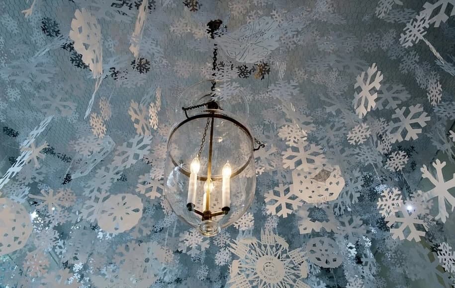 Во-первых, окна. Здесь не нужно придумывать ничего замысловатого: снежинки из белой бумаги отлично подойдут. Это украшение будет держаться столько, сколько вам нужно, его можно легко и быстро снять.