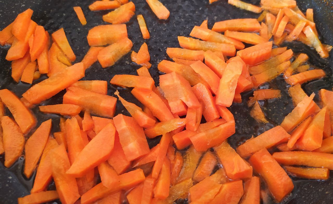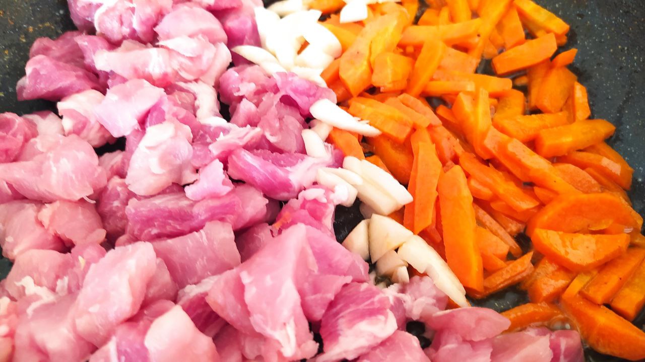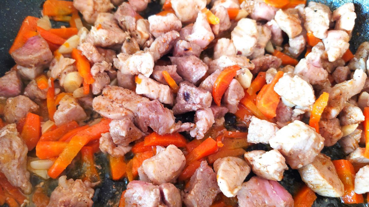 2. Через 5 минут добавить нарезанную на кубики свинину и рубленный чеснок. Посолить, поперчить. Жарить ещё минут 5–7.