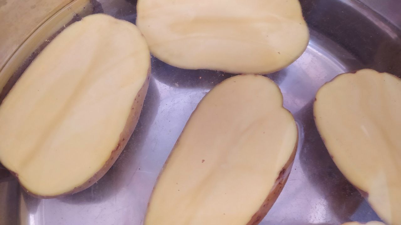 1. Картошку тщательно вымыть при помощи щётки. Разрезать пополам, опустить в кипящую подсоленную воду и варить в течение 5 минут.