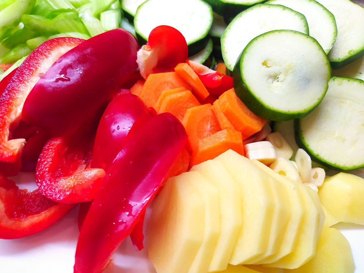 2. Овощи вымыть, просушить. Картошку, морковь и чеснок очистить. Нарезать крупно.