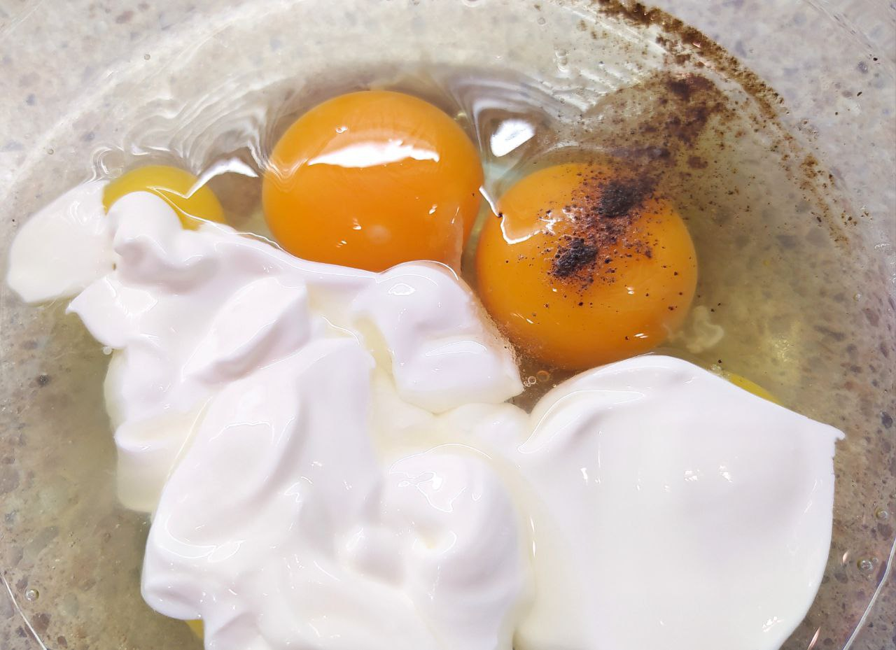 В глубокой ёмкости смешать яйца, сметану, сахар, соль, черный перец. Взбить.