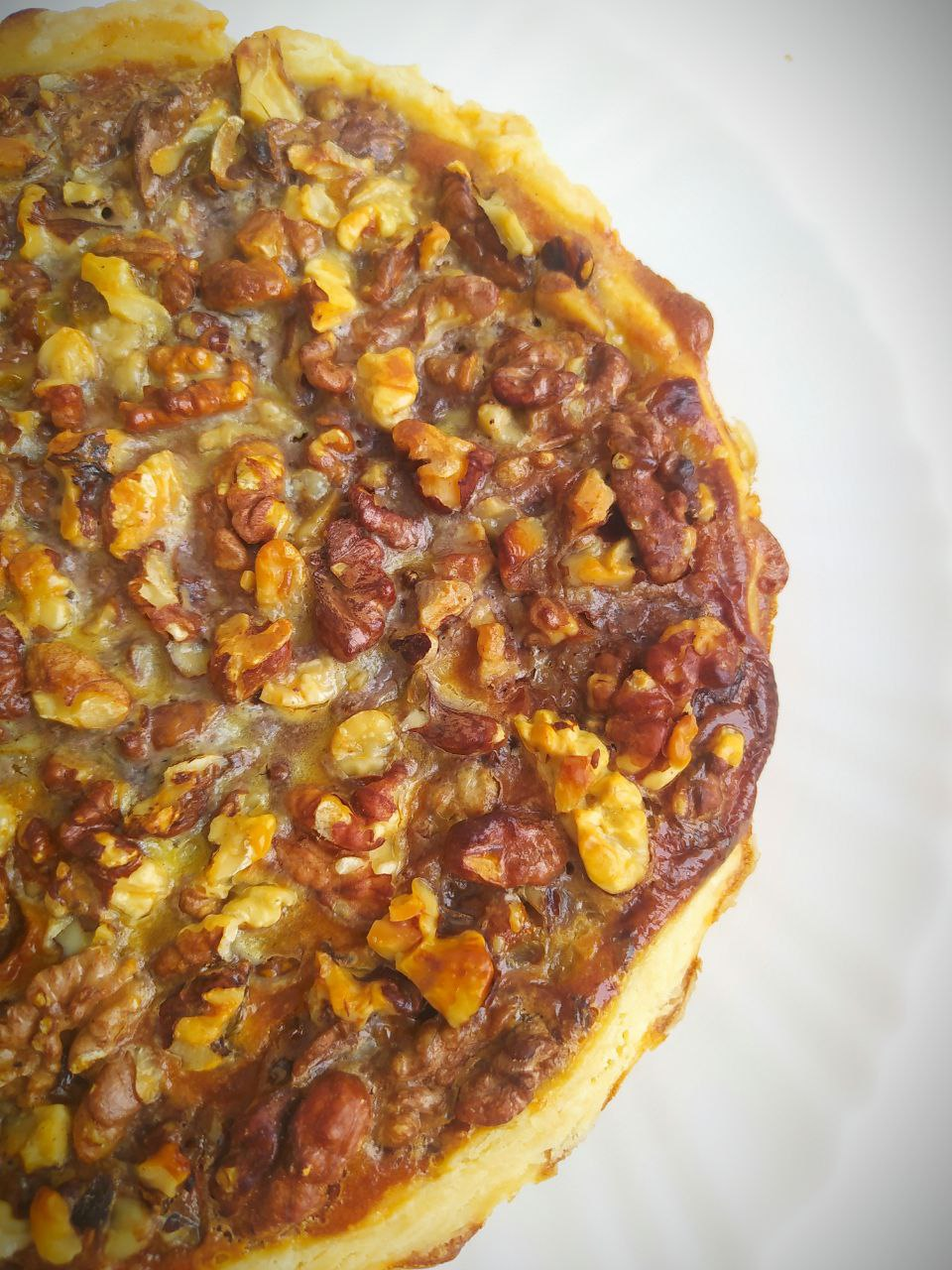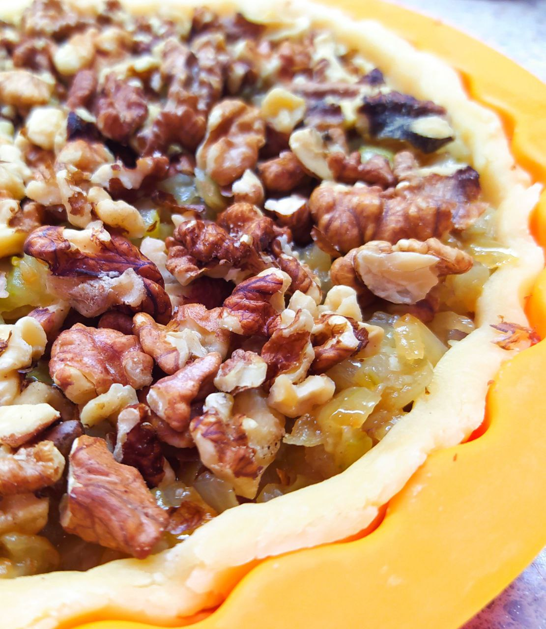 Положить лук, грецкие орехи, залить сметанно-яичной смесью.
