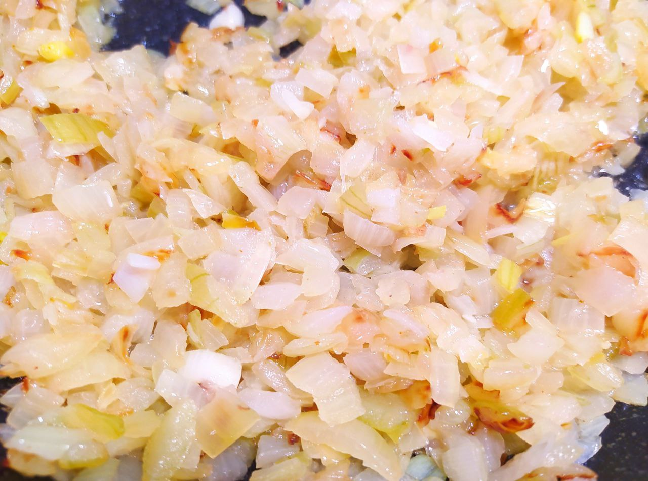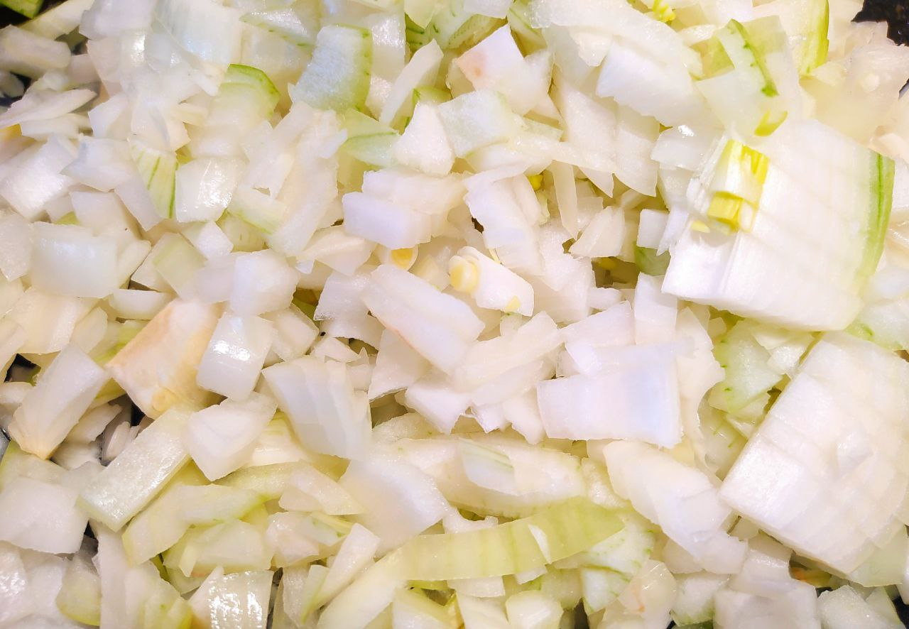 Лук мелко нарезать и пассеровать на медленном огне до золотистого цвета.