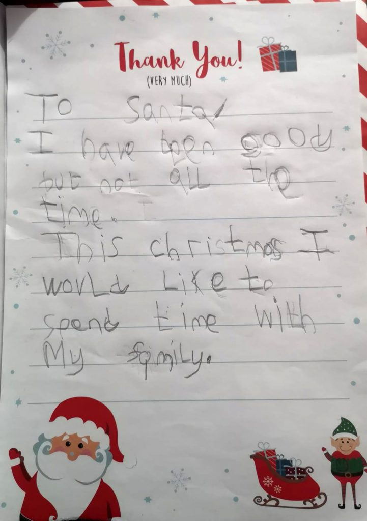 «Для Санты. Я был хорошим, но не всегда. В это Рождество мне бы хотелось провести время со своей семьёй», – написал мальчик.