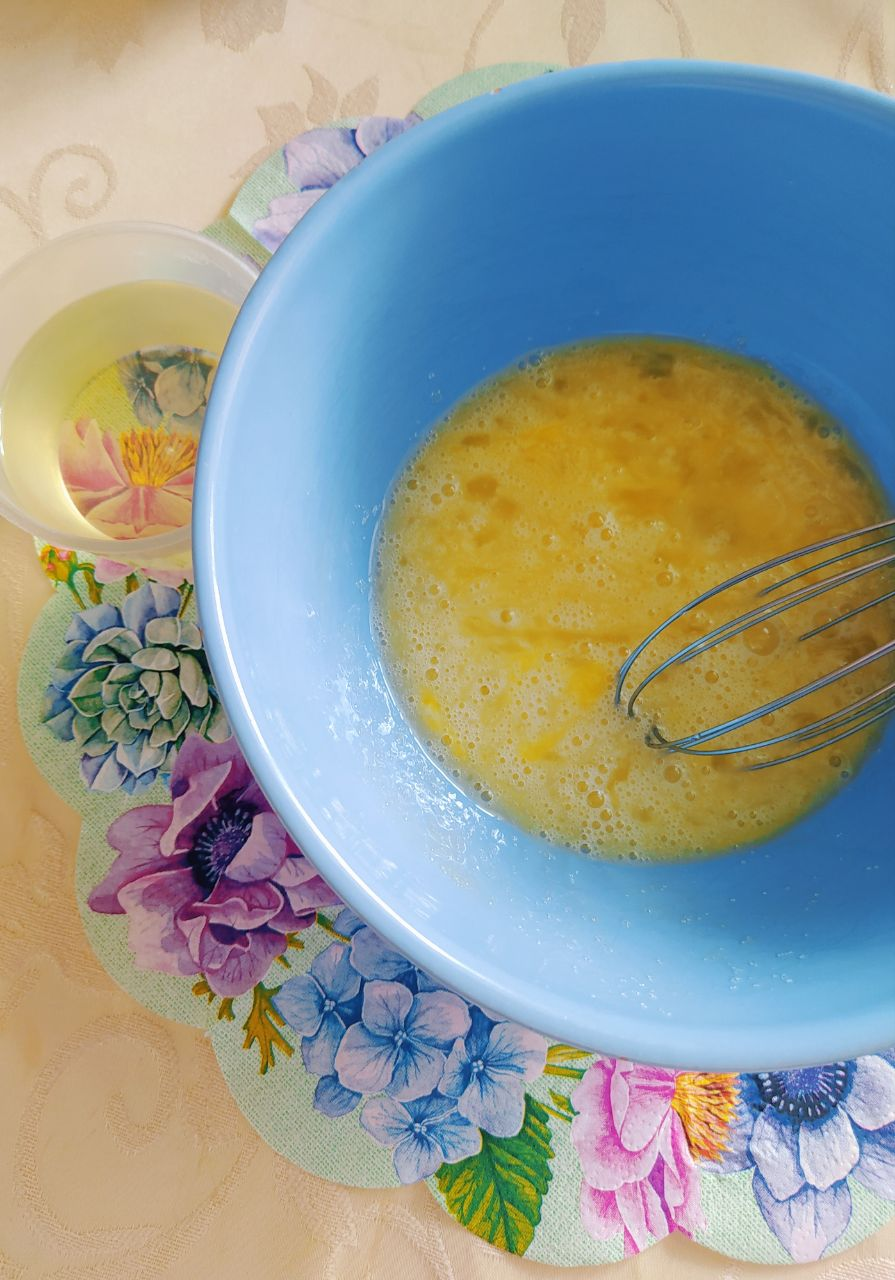 Яйца взбить венчиком, постепенно добавляя в них сахар и растительное масло.