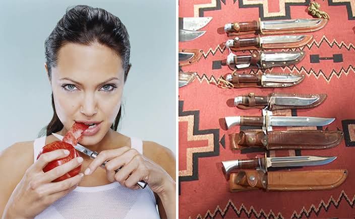 У Анджелины Джоли большая коллекция ножей. Первый нож она получила в подарок от матери в 13 лет, так началось её увлечение холодным оружием.