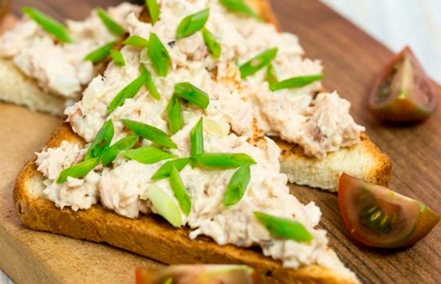 Кусочки хлеба необходимо смазать сливочным сыром, выложить сверху тунец, посыпать зеленым луком и черным перцем.