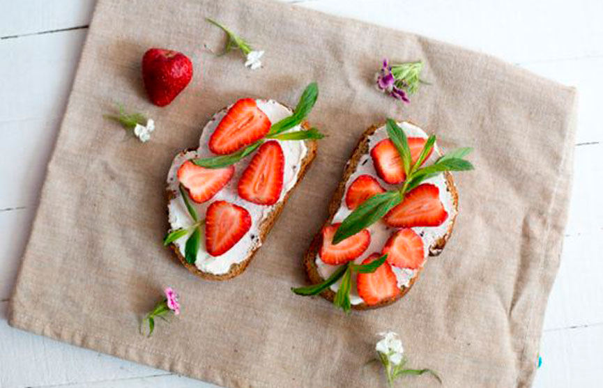 Полейте бутерброды 2–3 столовыми ложками клубничного джема, сверху уложите зерна граната. Полученные брускетты украсьте свежим листочками мяты или ветками розмарина.