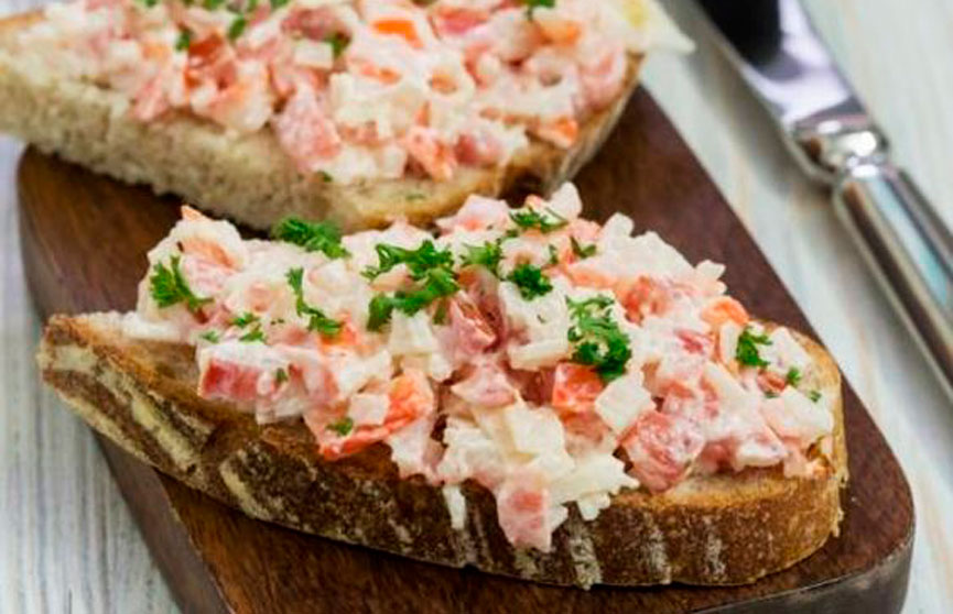 На разогретой сковороде (или в тостере) подсушить кусочки хлеба с двух сторон, затем намазать их майонезом. Разрезать на две части крабовые палочки, раскрыть каждую, освободив место для шпрот. А внутреннюю часть палочек измельчить и посыпать на смазанные майонезом кусочки хлеба. Внутрь крабовых палочек положить по 1 шт. шпрот, уложить на бутерброд. Сверху можно украсить тонкими продольными кусочками помидора.