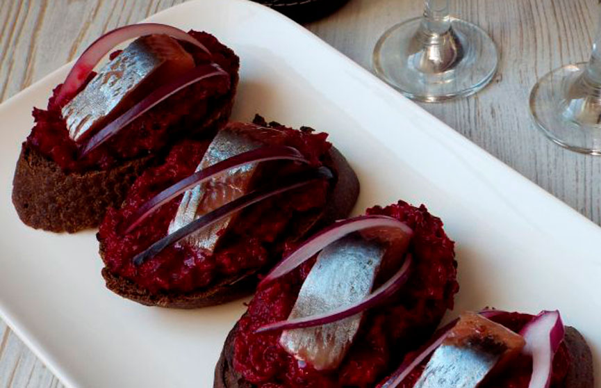 Нарежьте филе соленой сельди кусочками, 1 соленый огурец — кружочками, половину одной луковицы – полукольцами. Подрумяньте 5–6 ломтиков батона, выложите сверху свеклу, огурцы, рыбу и лук.