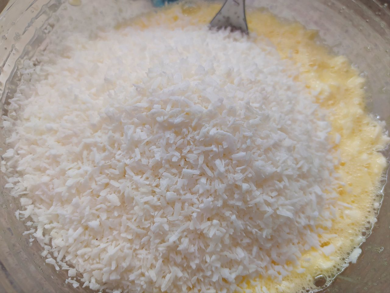 4. Затем по очереди ввести кокосовую стружку, муку и разрыхлитель. Перемешать.