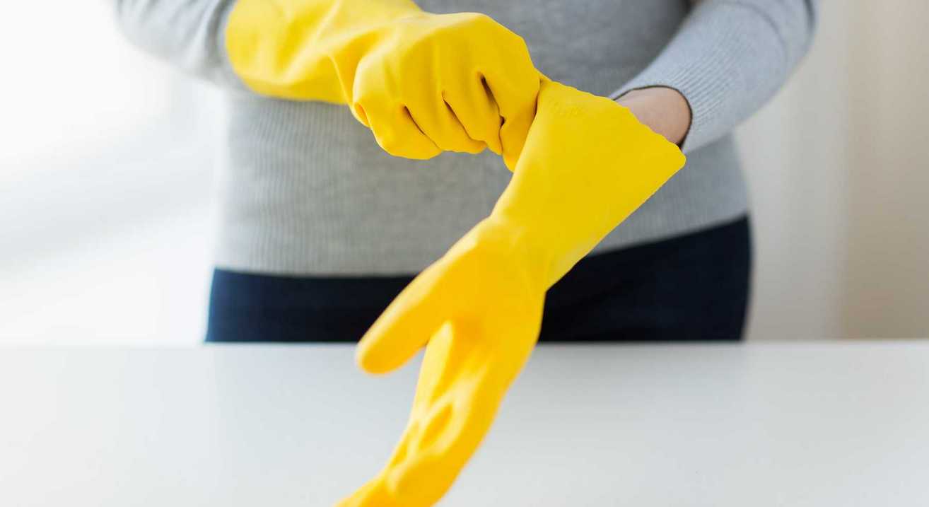 - найдите плотные хозяйственные перчатки и наденьте их;