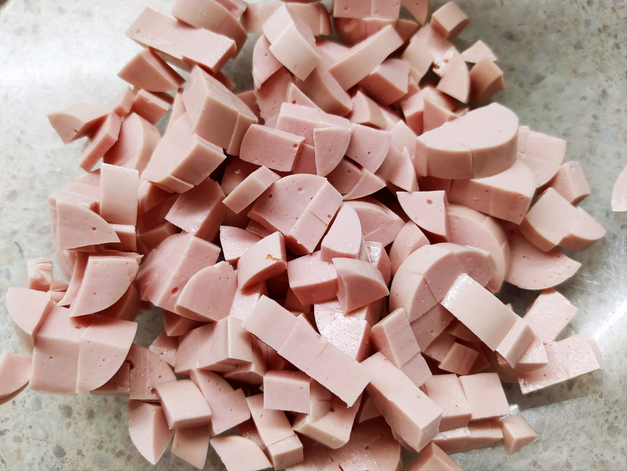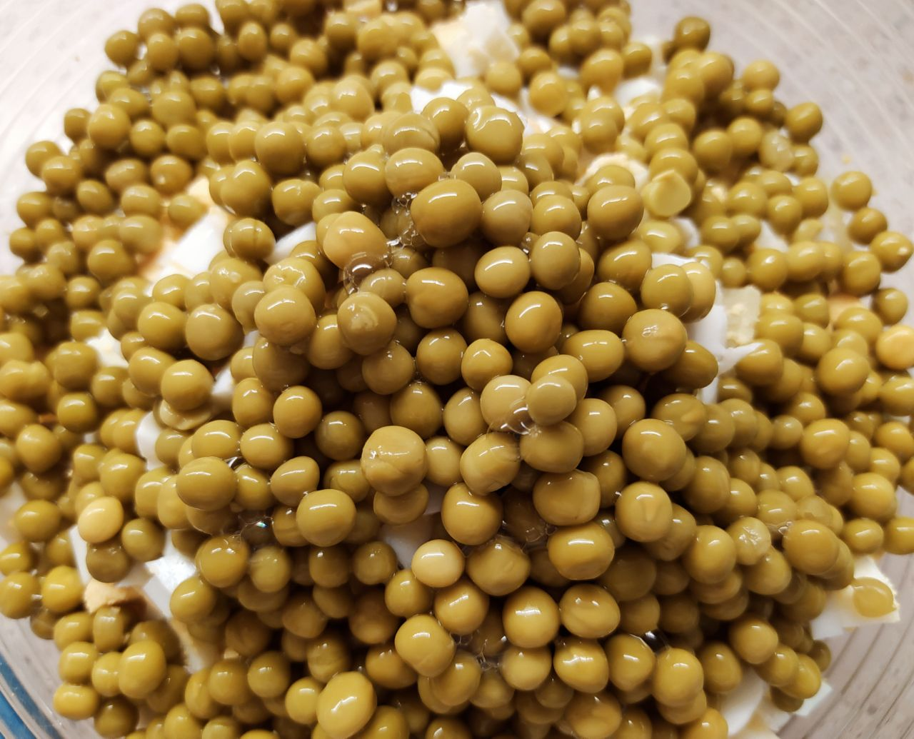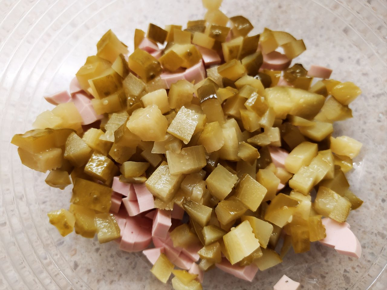 2. По очереди режем кубиками: сосиски, огурцы, морковь, картошку, яйца. Затем выкладываем зелёный горошек.