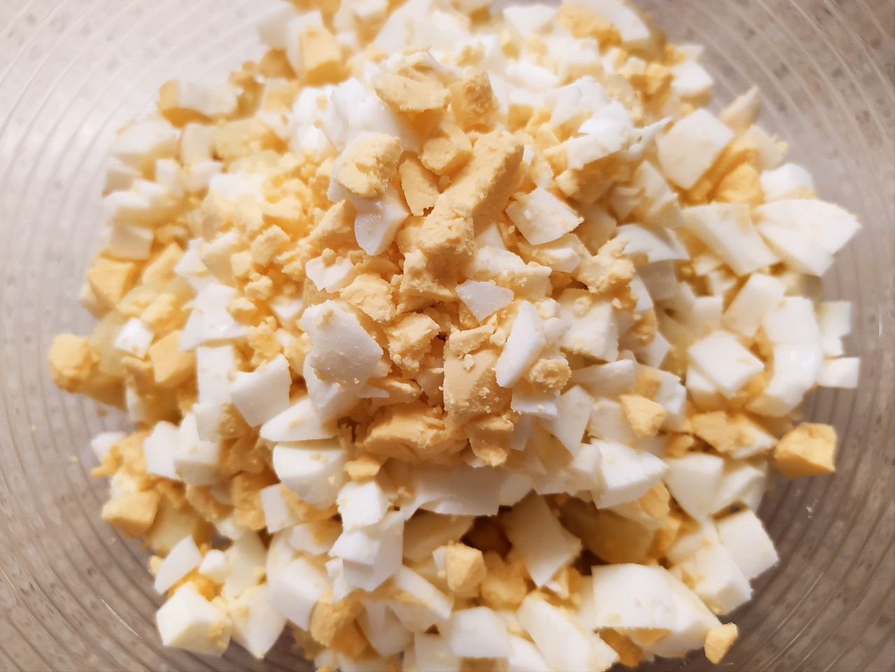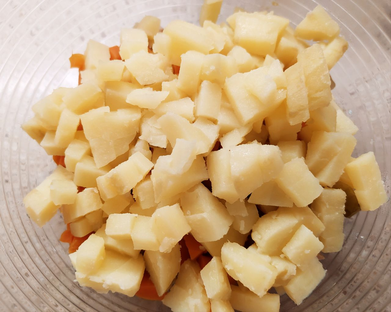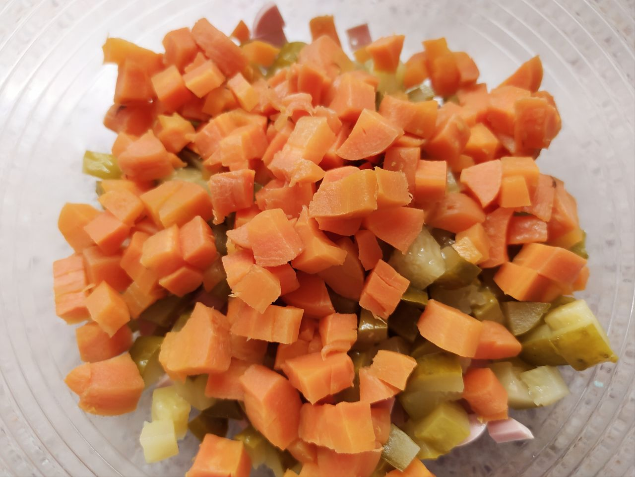 1. Подготовка ингредиентов. Морковь и картошку сварить в кожуре. Яйца сварить вкрутую. Остудить.