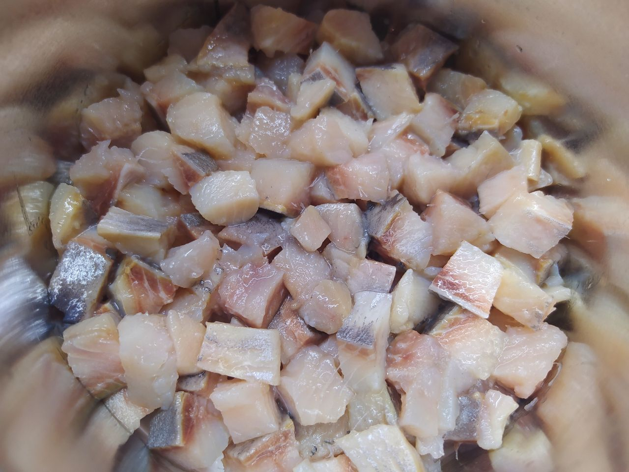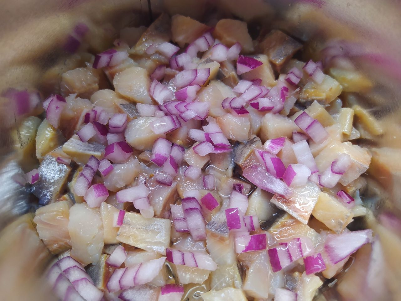 2. Филе сельди нарезать на кусочки. Лук измельчить.