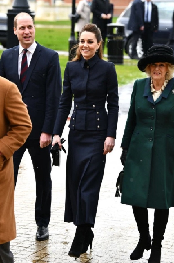Герцогиня вместе со своим мужем приехала в военно-медицинский реабилитационный центр в Лафборо, чтобы поддержать пациентов и сотрудников. Для визита она выбрала тёмно-синий жакет в стиле милитари и юбку от Alexander McQueen, дополнив образ сапогами на шпильках от Ralph Lauren и клатчем от британского бренда Mulberry.