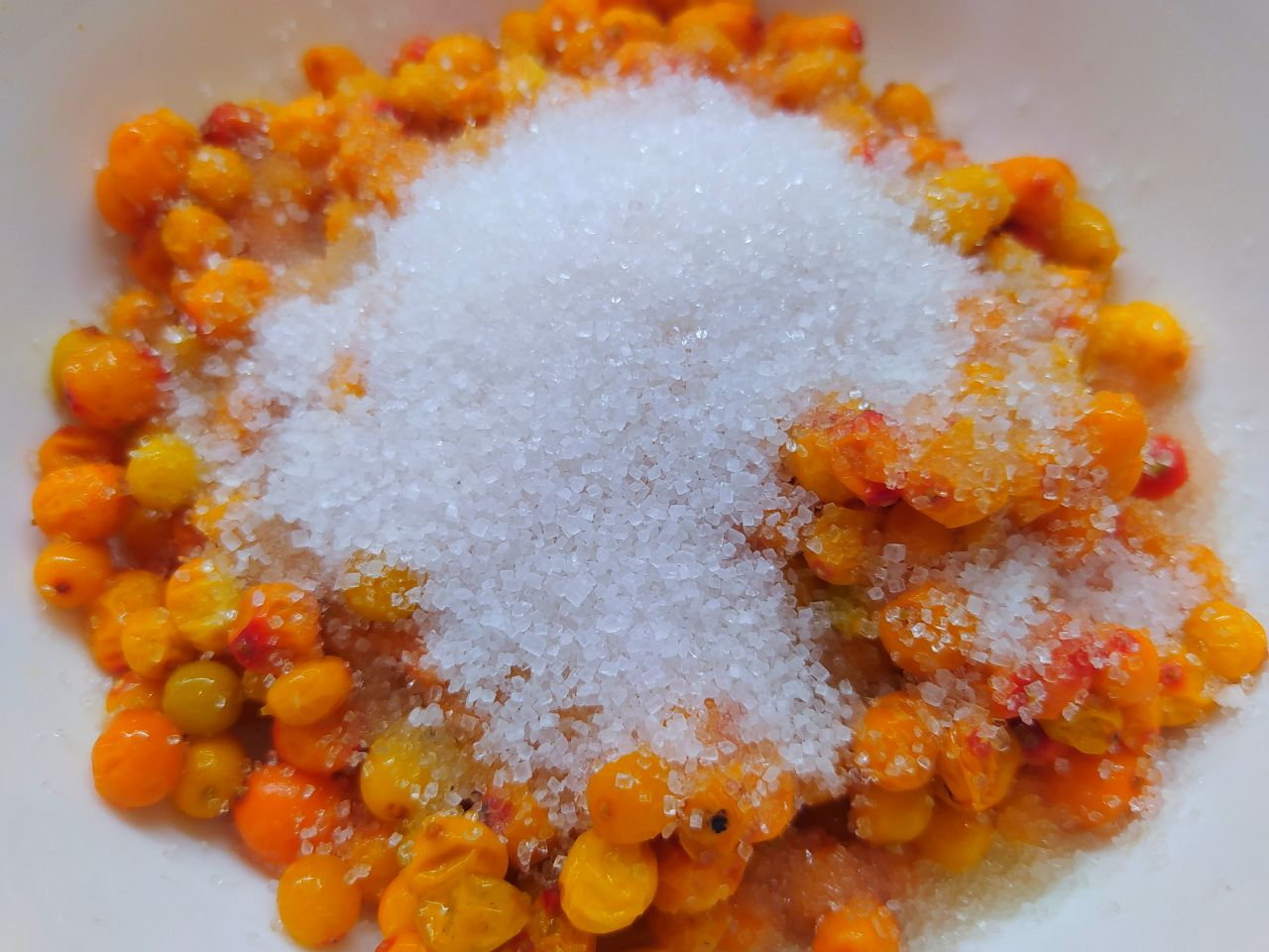2. Раздавить ягоды, чтобы они пустили сок. Добавить сахар. Перемешать.
