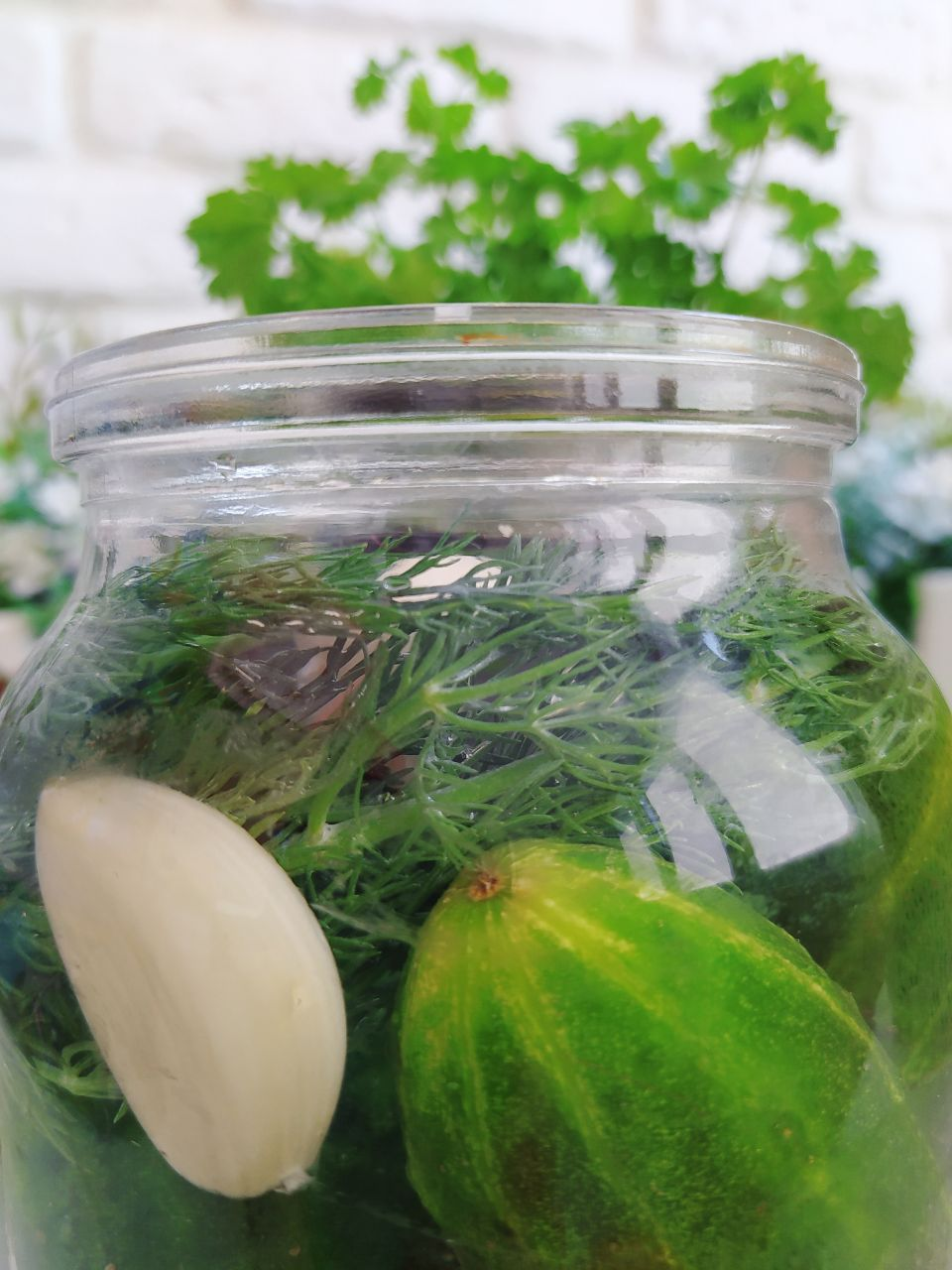 Огурцы тщательно моем и выкладываем в 3-литровую банку. Добавляем чеснок, сверху кладём укроп. Заливаем огурцы рассолом и оставляем банку при комнатной температуре на 1-2 часа. Затем убираем в холодильник.