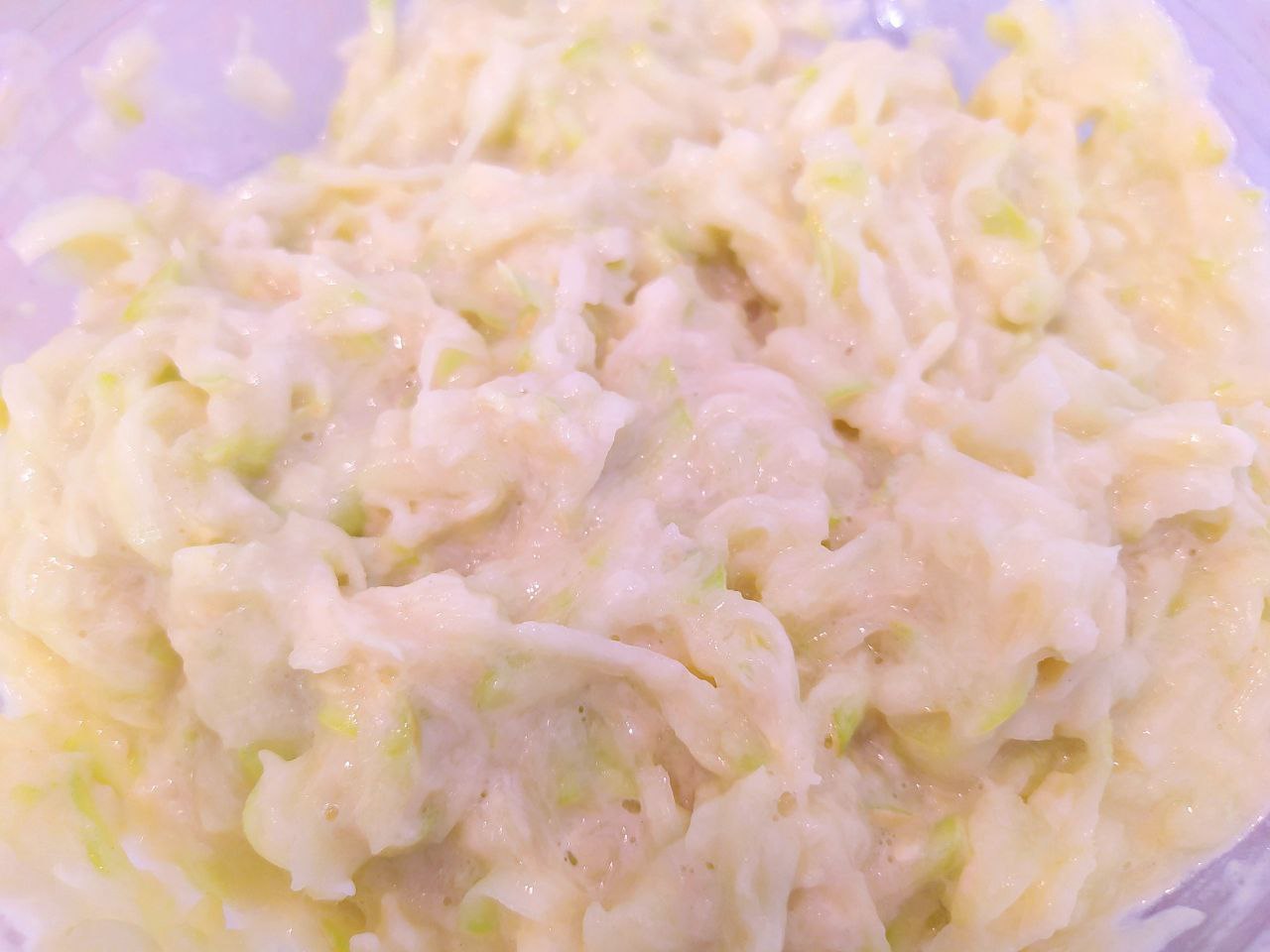 2. В емкость с кабачком добавить яйцо, муку, соль и лук, натертый на мелкую терку. Хорошенько перемешать.