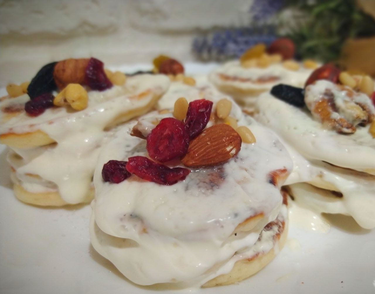 Ну, а если смазать оладьи сметаной с сахаром, украсить орехами, сухофруктами и поставить в холодное место на пару часов, то получим прекрасный десерт.