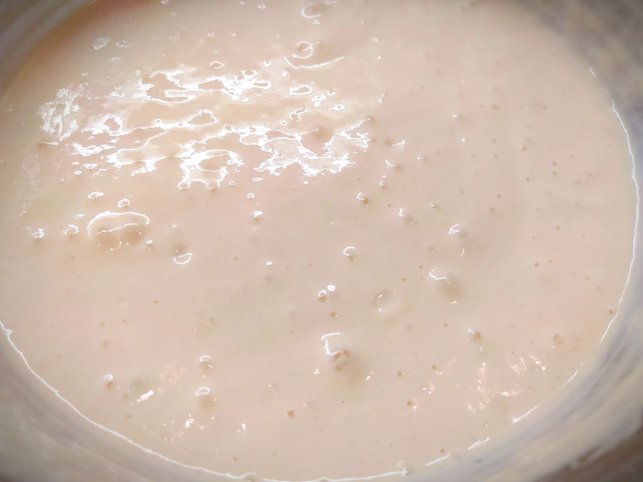 2. Муку просеять, добавить в кефир небольшими порциями, постоянно помешивая венчиком.