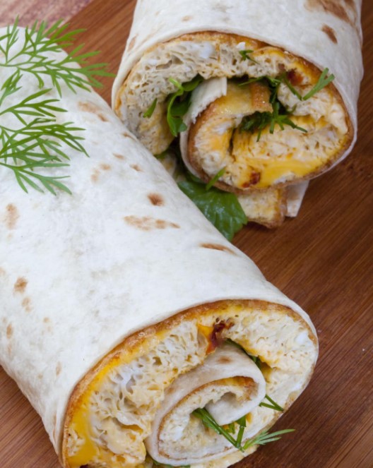 Как готовить: взбейте 4 яйца, добавьте 4 нарезанных вяленых томата, перемешайте, посолите и жарьте на сковороде с растительным маслом под закрытой крышкой. Готовый омлет нарежьте на куски, разложите по лавашу, посыпьте зеленью, сверните и нарежьте на небольшие рулеты.
