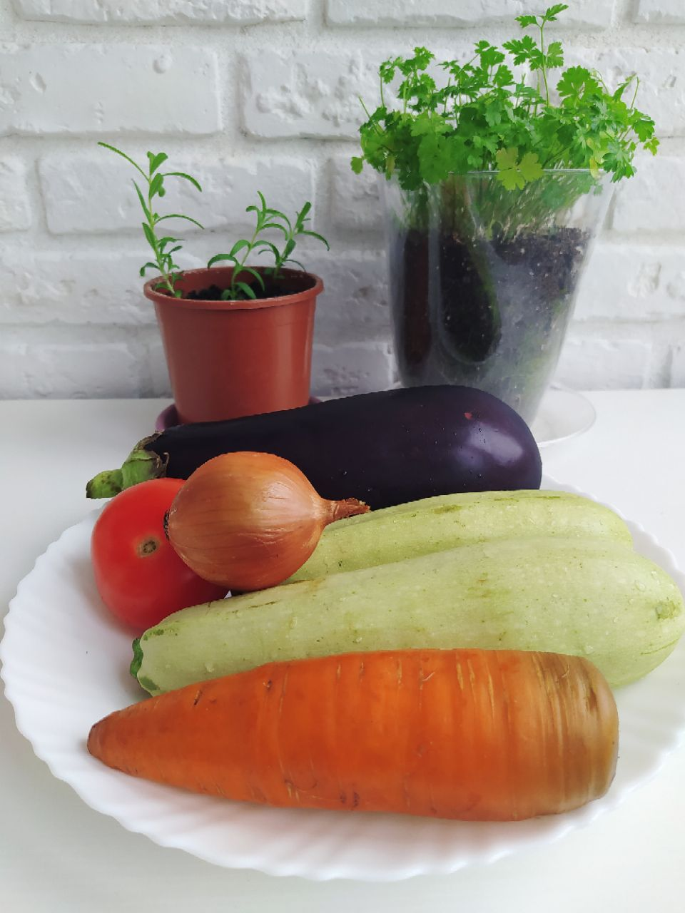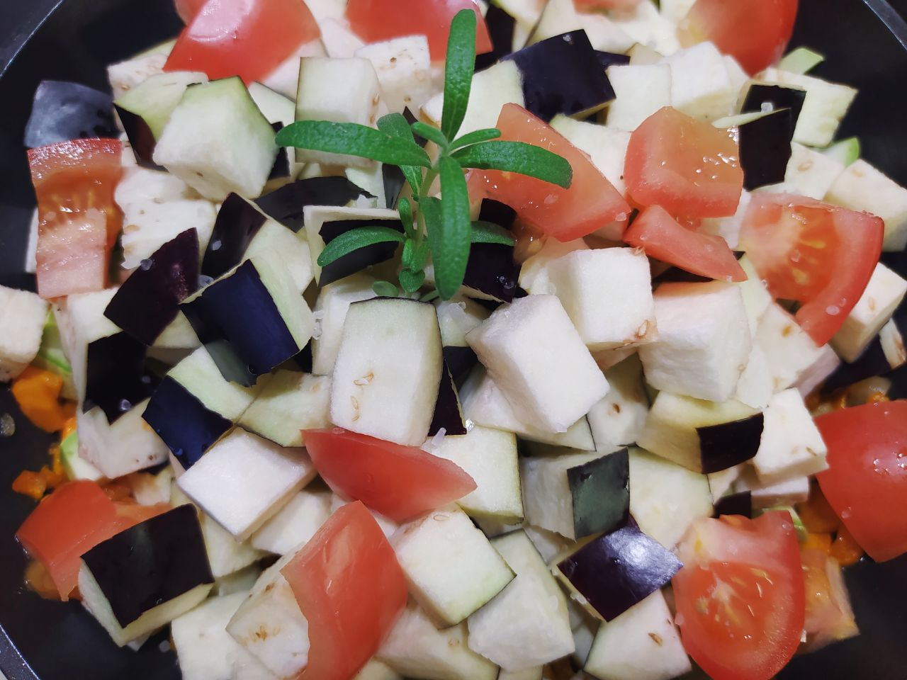 3. Кабачок нарезать кубиками и добавить к моркови и луку. Туда же положить баклажан, предварительно вынув из воды, и помидор. Овощи посолить, можно добавить веточку розмарина.