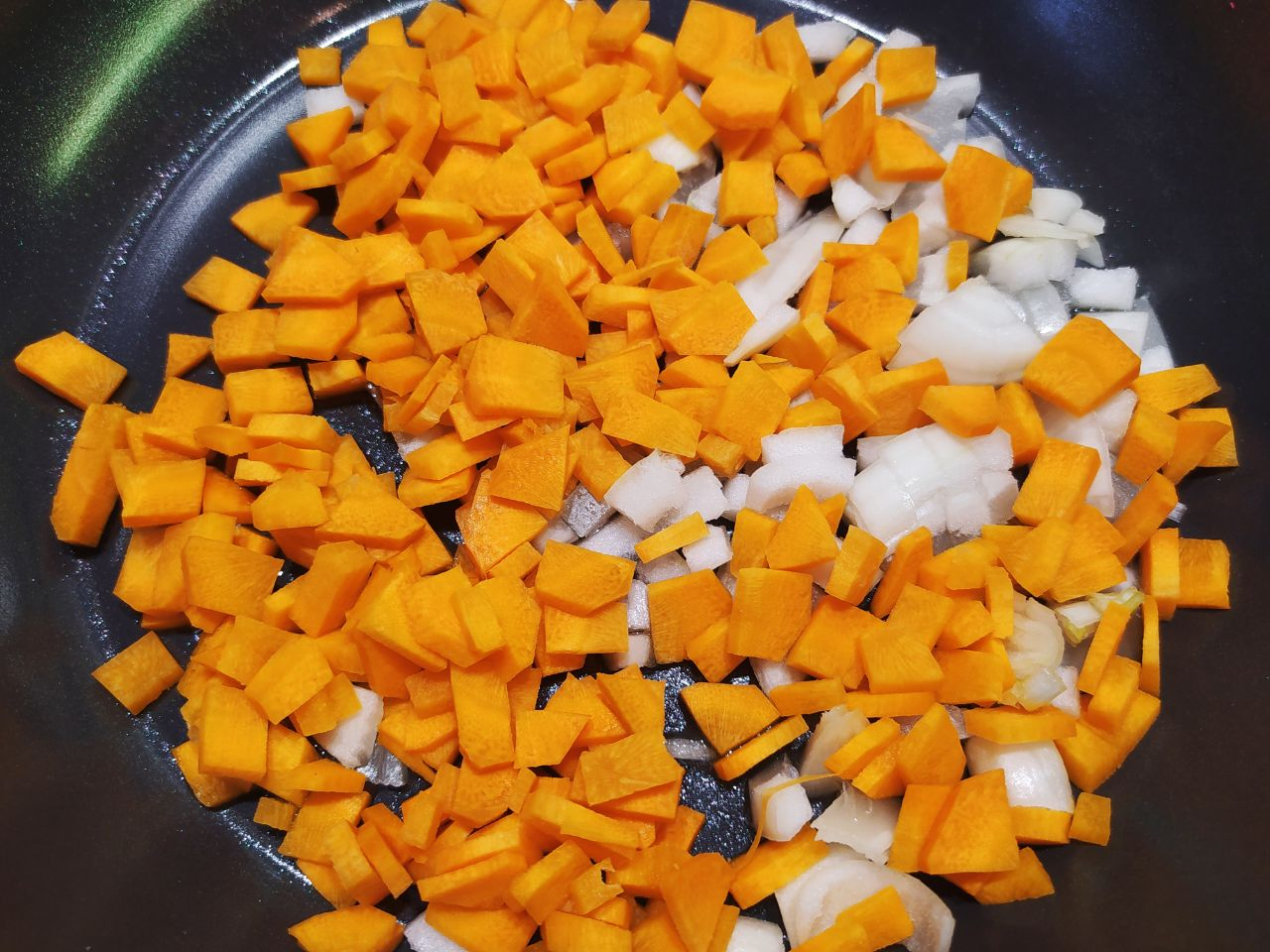 2. Морковь нарезать кубиками, лук нарезать мелко. И морковь, и лук обжарить на растительном масле в течение 5-7 минут.