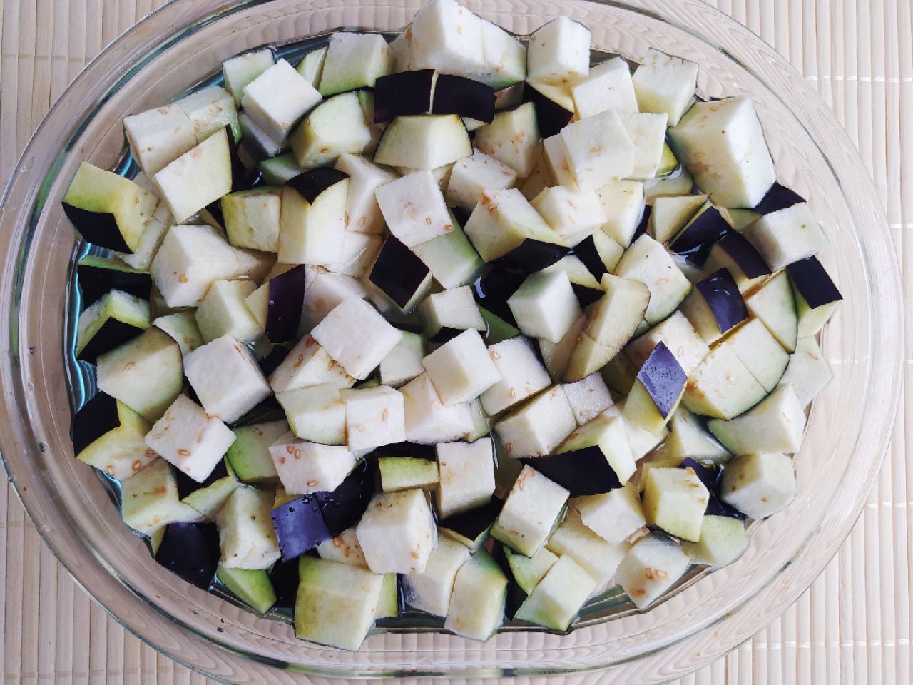 1. Баклажан нарезать на кубики, выложить в глубокую ёмкость, залить водой и оставить на 10-15 минут, чтобы ушла горечь.