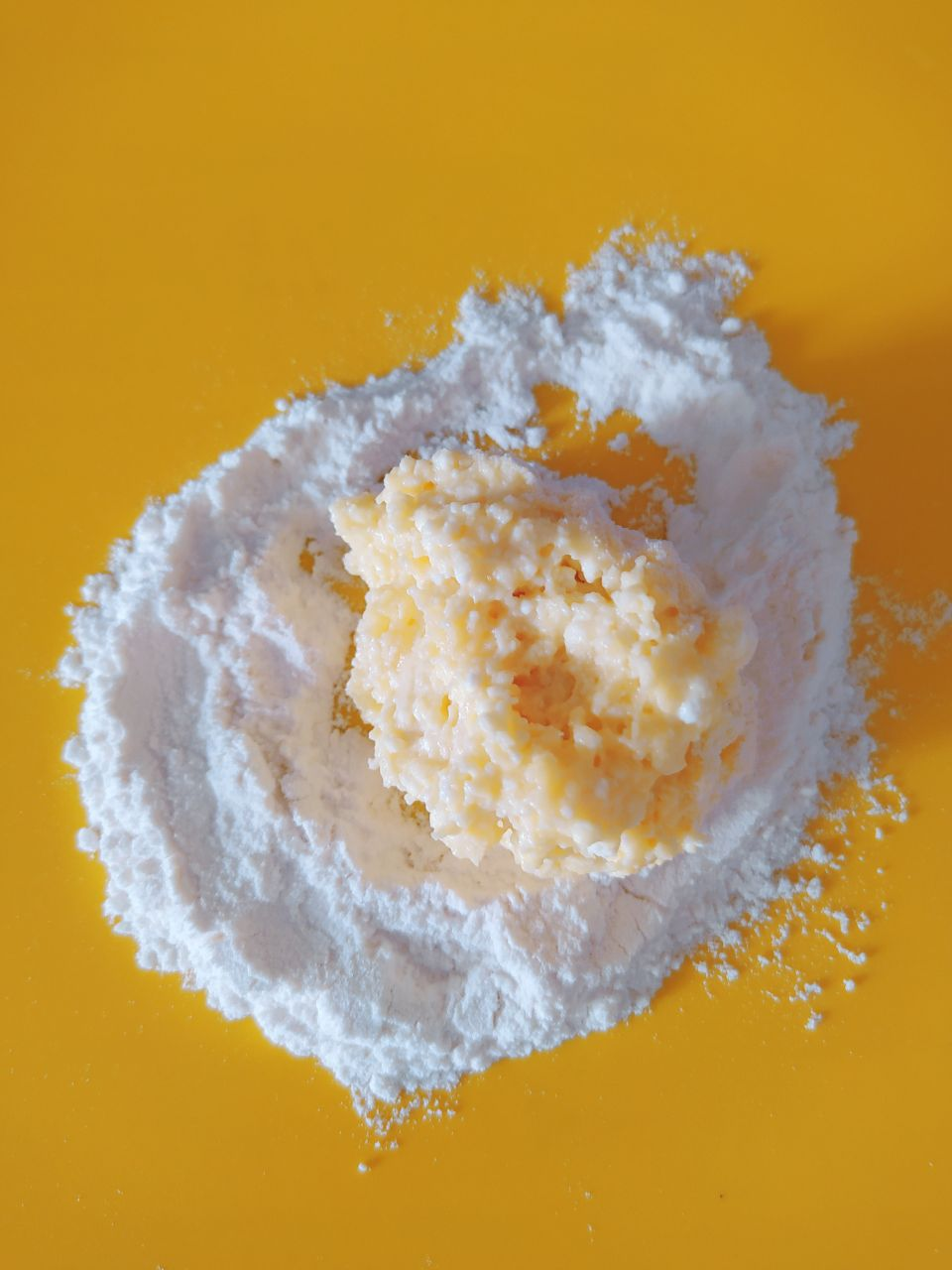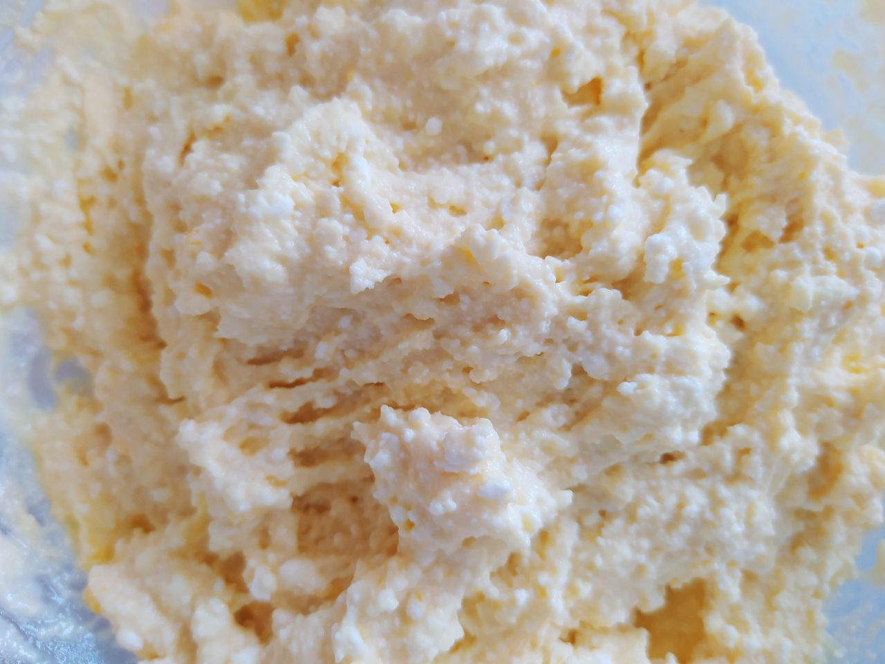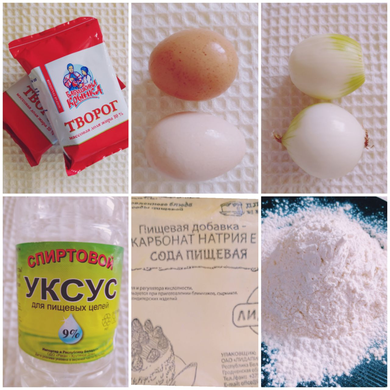 Творог размять вилкой, добавить яйца, муку, соль, сахар, соду (погасить уксусом). Хорошенько перемешать.