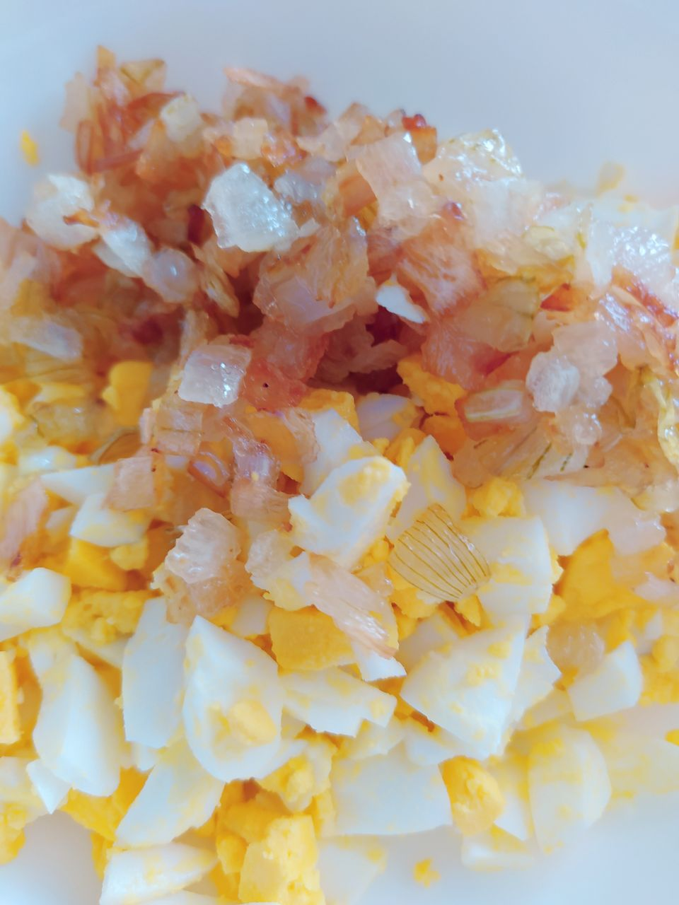 Яйца отварить вкрутую, охладить и мелко нарезать. Добавить к луку и перемешать.