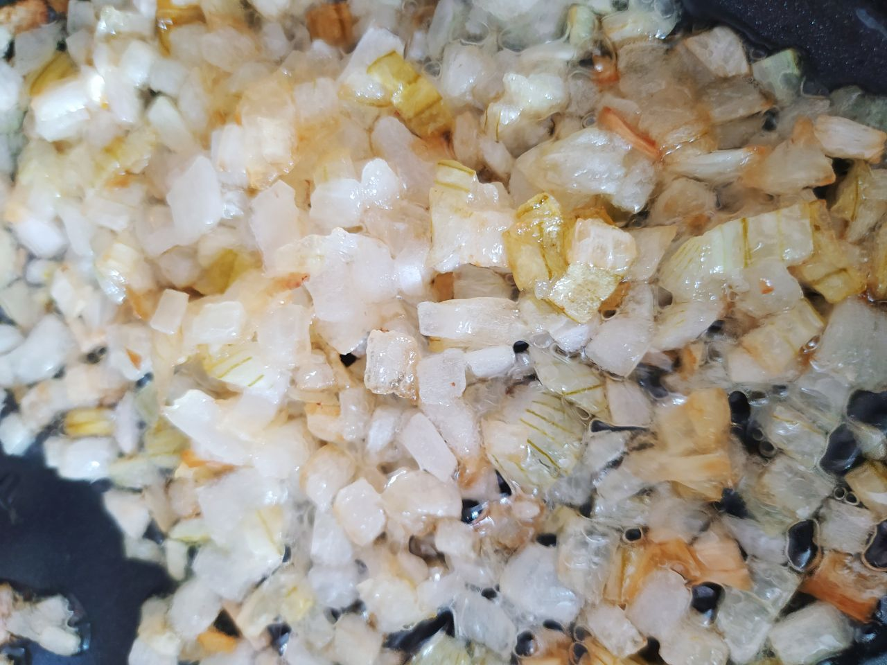 Лук мелко порезать и пассеровать на медленном огне до золотистого цвета.