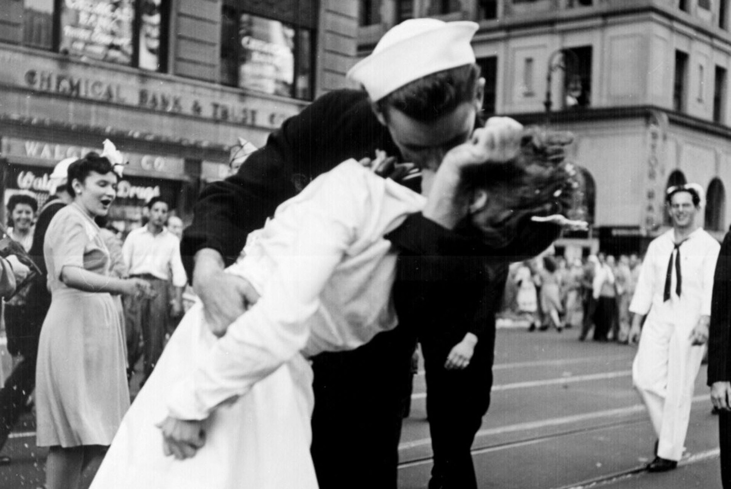 Пятерку замыкает легендарный фотосюжет: моряк, целующий девушку на Таймс-сквер в Нью-Йорке после победы во Второй мировой войне.