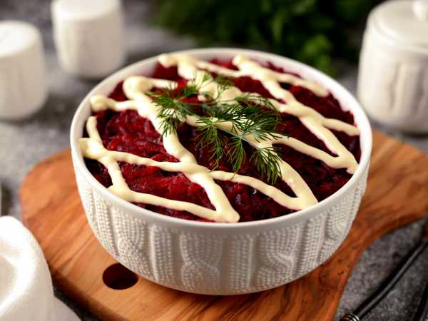 Последним слоем уложите тертую свеклу, закройте майонезом.
