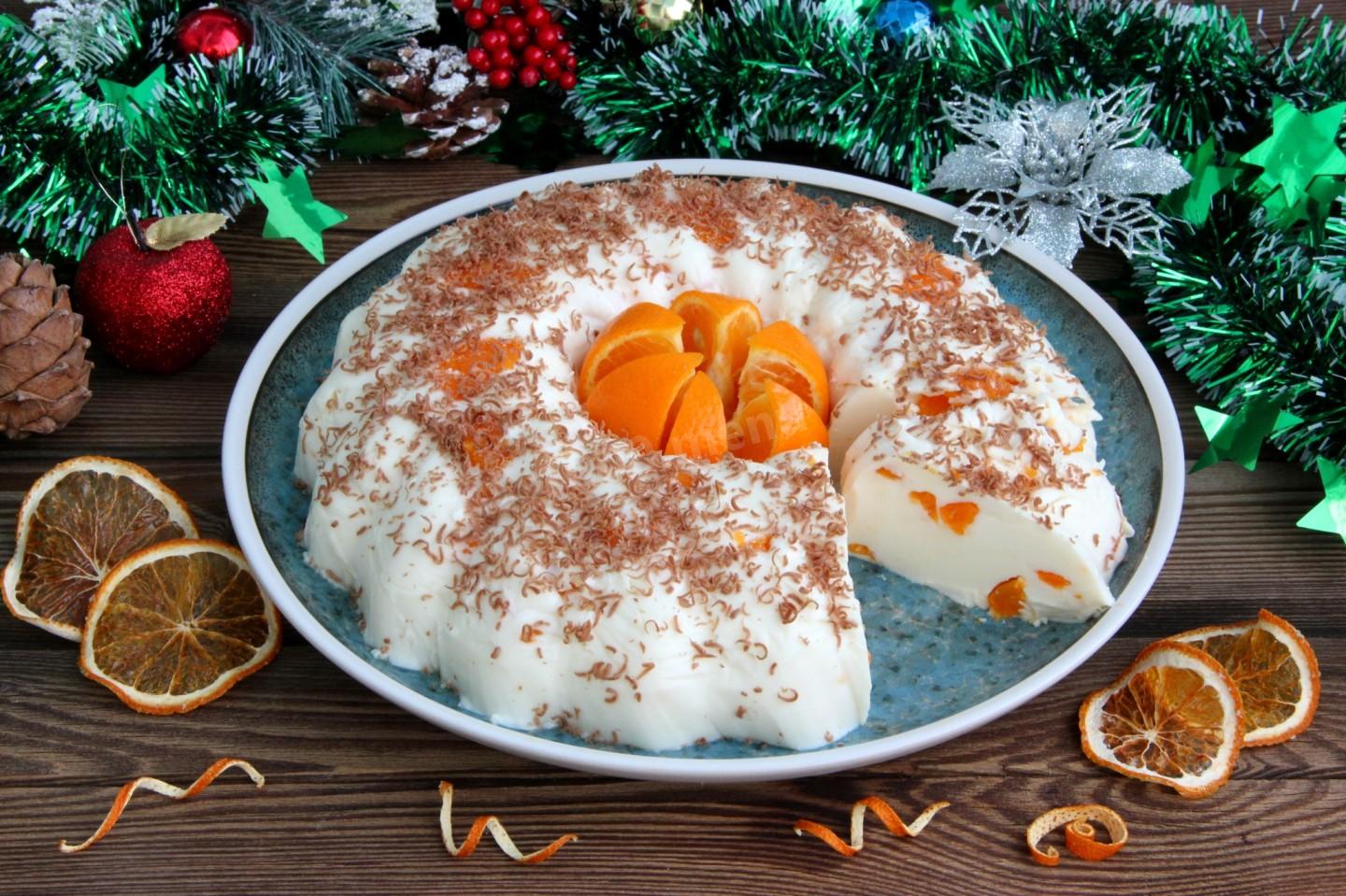 Застывший десерт достать из формы, украсить мандаринами и натертым шоколадом.
