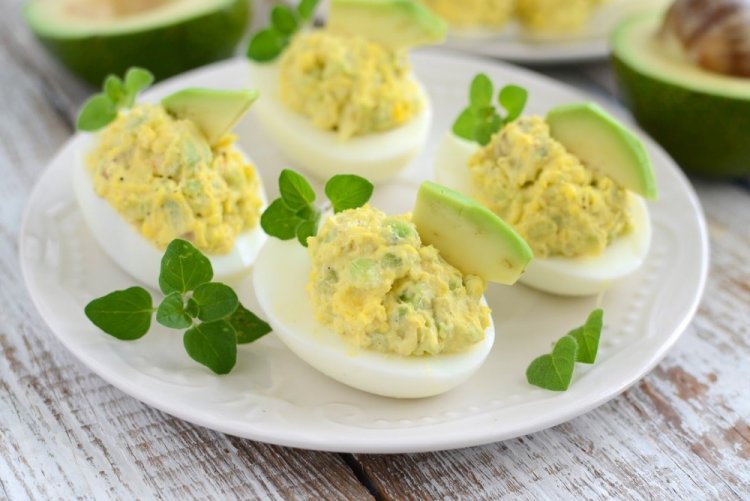 Яйца сварить вкрутую, почистить, разрезать пополам, отделить желтки от белков. К желткам добавить очищенный авокадо, масло, сок лимона, размять вилкой. Добавить в массу натертый сыр, специи и измельченный чеснок, перемешать. Получившейся начинкой нафаршировать половинки белков, украсить зеленью.