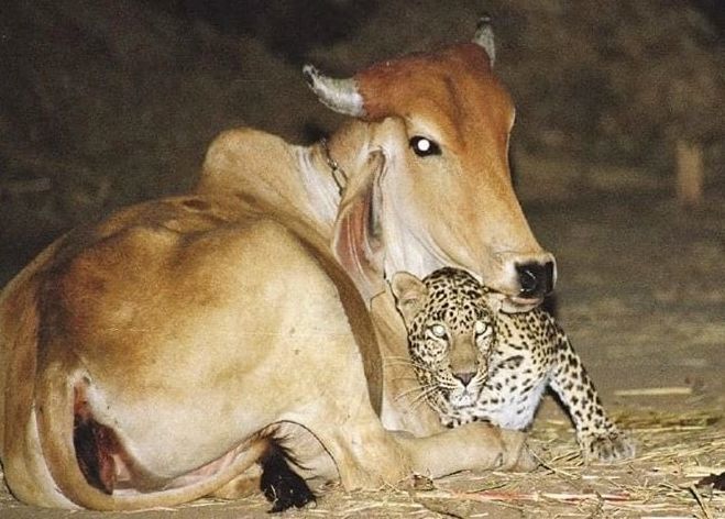 Неизвестно, на какой почве появились подобные отношения – не исключено, что леопард еще котенком был спасен и выкормлен рогатой кормилицей. По мнению специалистов, хищник вырос среди людей и привык в том числе к домашним животным.