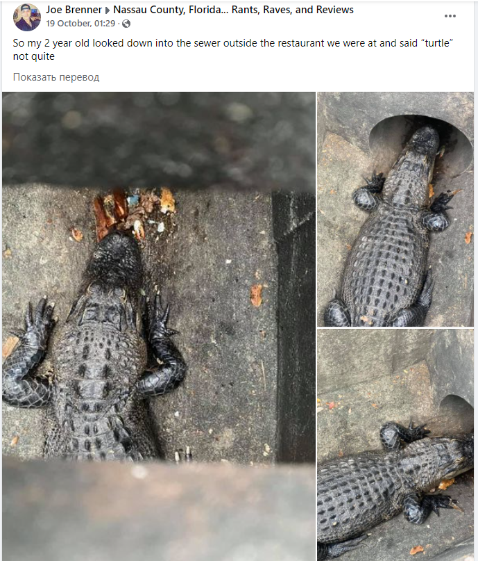 О происшествии рассказал отец ребенка – Джо Бреннер. Когда они выходили из ресторана в Джексонвилле, малыш предупредил папу о черепахе в канализации. Обнаружилось, что это мальчик ошибся – там был всего лишь большой аллигатор.