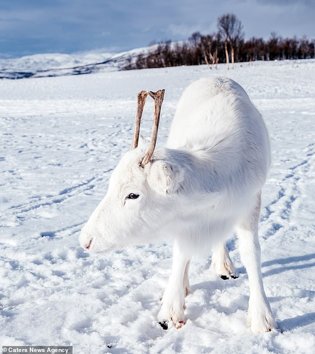 Редкий белый северный олень обнаружен в пустыне в Норвегии, пишет Daily Mail.